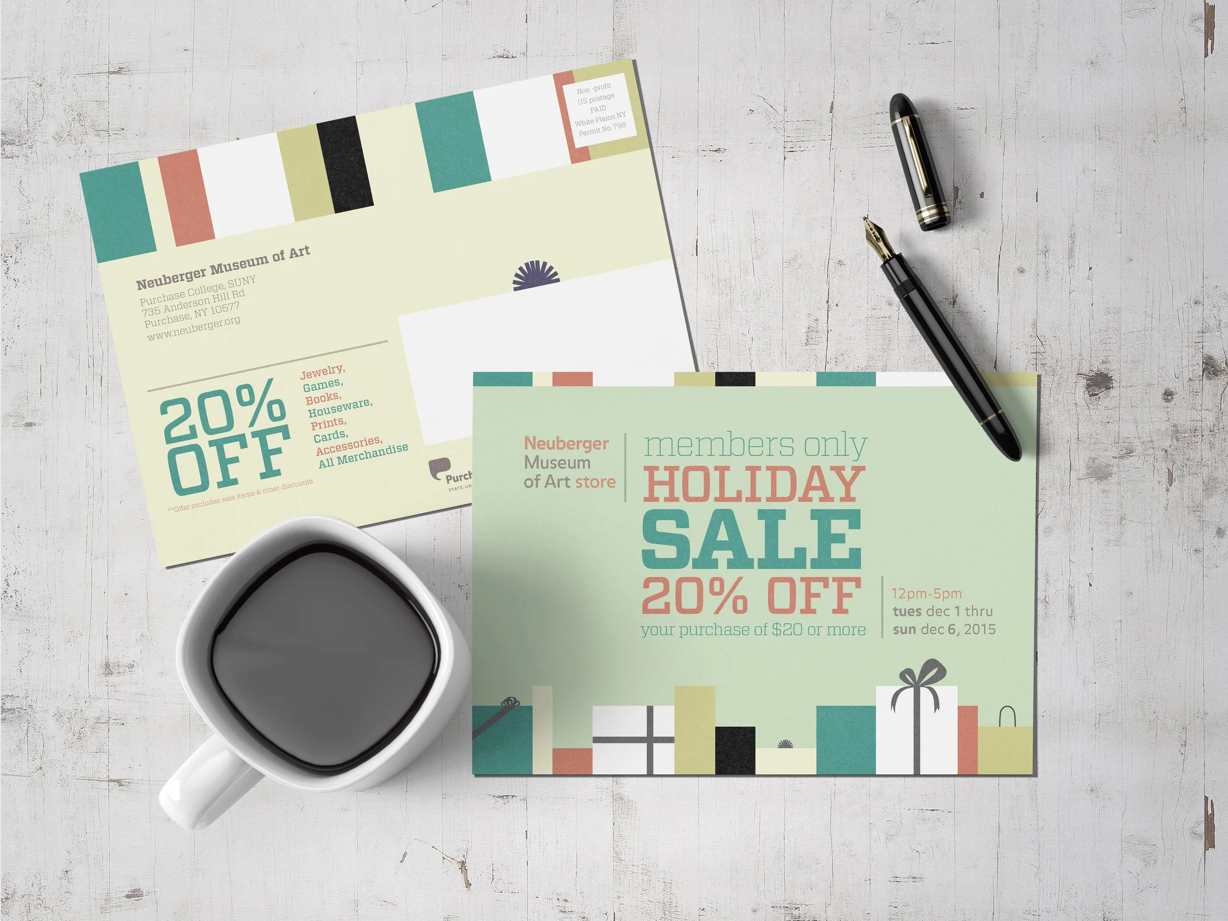 Designed for a holiday sale event at the Neuberger Museum of Art located on the SUNY Purchase College campus. It was created to advertise a winter holiday sale at the museum’s gift shop. The card was sent to locals, frequent visitors, and college students.